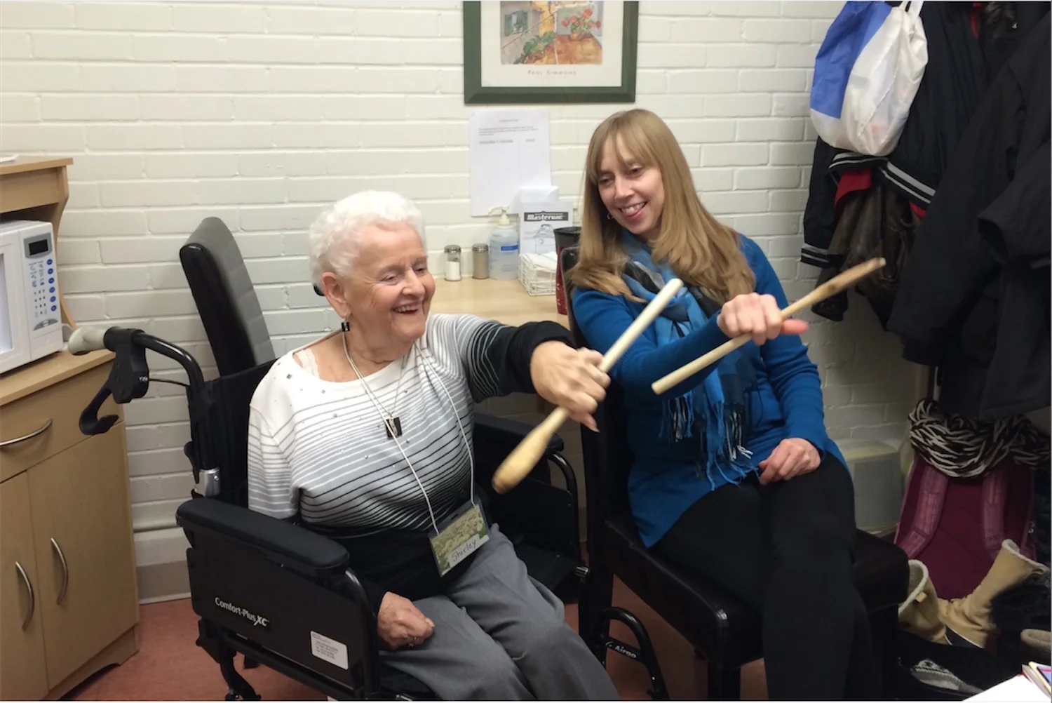 During her teen years, Shirley was a majorette for the Orange Order of Canada. Here she shows Shirley (Program Staff) how to twirl a baton!